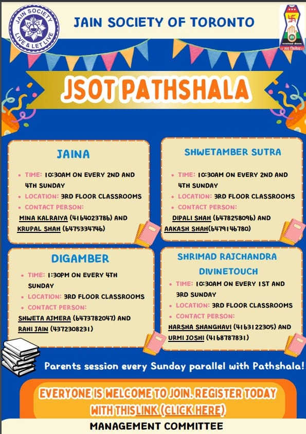 The Jain Society of Toronto (JSOT) was established in 1974 by a group of Individuals with the aim of promoting cultural and community services to Jain individuals who have come into the country.